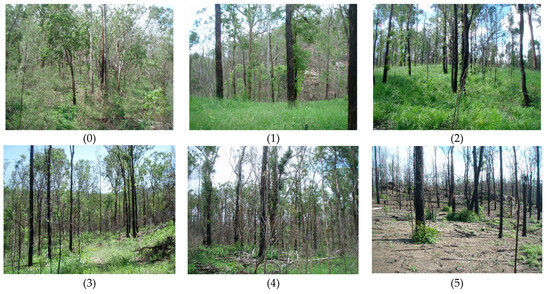 Typical burn severities of eucalypt forest three months after the fire in the local study area. Ratings range from 0 to 5. (0) None. (1) Low (<2 m scorch)—note recovery of the ground layer. (2) Moderate low (2–5 m scorch)—note some epicormic shooting. (3) Moderate high (just trunks scorched >5 m OR a minority of crowns scorched). (4) High (most crowns scorched)—note recovery via epicormic shooting. Also note recovery of ground layer, which may look like canopy recovery from remote sensing. (5) Severe (crown foliage gone, ground bare)—note topkill and recovery via coppicing.