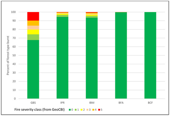 Regional fire severity percentages of total area for each forest type tested (GBS, IPR, IBM, BFA, BCF) for 2019, the year of the fire. The regional study area defined by the Sentinel-2 scene is 12,056.04 km2. Forest types: GBS = grey gum, mountain blue gum, and stringybark (RE 12.12.23); IPR = ironbark on ridges (RE 12.12.12); IBM = ironbark and mountain blue gum on microgranite (RE 12.8.16); BFA = blue gum flats on alluvium inland (RE 12.3.3); BCF = blue gum flats on alluvium closer to the coast (RE 12.3.11). GeoCBI burn classes: 0 = none, 1 = low, 2 = moderate low, 3 = moderate high, 4 = high, and 5 = severe.