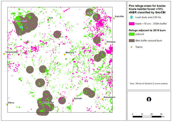 Koala habitat areas suitable for refuge from fire. View covers the entire Sentinel-2 scene. Criteria are (1) koala habitat forest type; (2) fire severity class 0—unburnt; (3) proximity to burnt areas with moderate, high, and severe ratings—classes 2, 3, 4, and 5; and (4) proximity to recorded koala sightings.