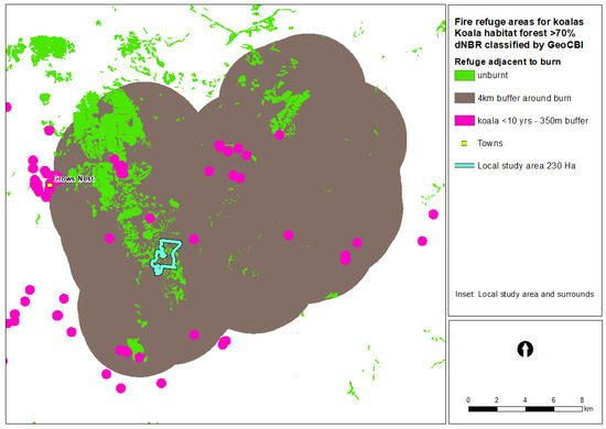Koala habitat areas suitable for refuge from fire were identified using the following criteria: (1) the definition of koala habitat forest type as specified in our study (i.e., REs were GBS, IPR, IBM, BFA, and BCF); (2) fire severity class 0 = unburnt; (3) proximity to burnt areas of moderate, high, and severe ratings—classes 2, 3, 4, and 5; (4) proximity to recorded koala sightings. Only koala habitat forest type areas with a koala sighting recorded less than 10 years ago were included to increase the likelihood of a koala being present in these mapped forest types.