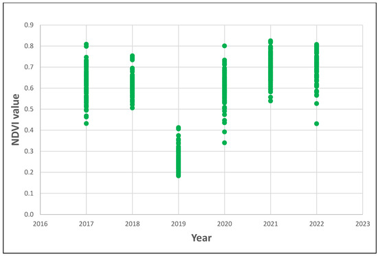 The NDVI measurements indicated that vegetation cover returned to previous extents during the recovery phase after the fires (Figure 6). A significant drop in NDVI values in 2019 was confirmed (p < 0.001, Kruskal–Wallis H = 330.277).