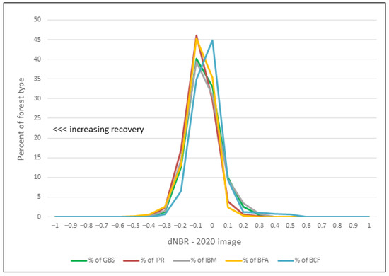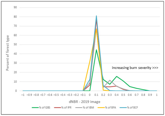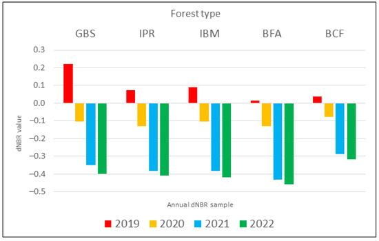 The mean dNBR values for each forest type studied were all positive (>0) in the year of the fire (2019) and then in all cases became increasingly negative in progressive years of recovery (2020, 2021, 2022; Figure 7). The results for all the forest types are similar, except for GBS, which experienced the greatest fire impact (dNBR > 0.2), and BCF, which showed the least apparent recovery from fire, with dNBR values for each recovery year of about −0.3, whereas the other forest types showed dNBR values of about −0.4.