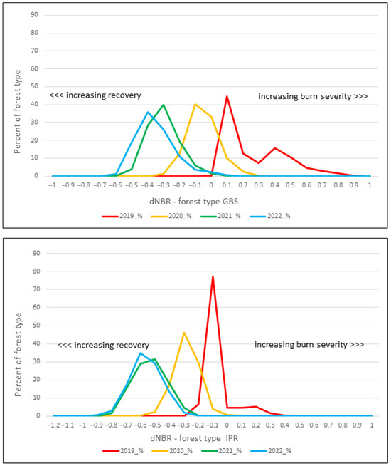 A comparison was also made of the yearly changes in the total areas for each 0.1 increment in dNBR (CISR) for each forest type (RE) across the regional study area (Figure 10). For all the REs studied, the values and peak values of dNBR were highest in the year of the fire (2019) and became progressively lower in the subsequent years of recovery. The forest type GBS was the only RE studied that had a bimodal distribution of high fire severity, with a higher fire severity impact overall. All forest-type REs then experienced a reduction in their dNBR values in the first year of recovery (2020; e.g., IPR, Figure 10) and then a further reduction in dNBR in the second and third years (2021 and 2022). For all forest types studied, there was no further reduction in dNBR values from 2021 to 2022, indicating that minimal change occurred from 2021 to 2022 (Supplementary Figures S10–S12). This correlation of dNBR distributions between 2021 and 2022 was confirmed to be highly significant (p < 0.001), with Spearman values of rs = 0.953 for GBS, rs = 0.948 for IPR, rs = 0.969 for IBM, rs = 0.967 for BFA, and rs = 0.976 for BCF. All other rs values were less than 0.9, and, in most cases, they were less than 0.8, indicating that the dNBR values were similar between other years but not as closely correlated as between 2021 and 2022.