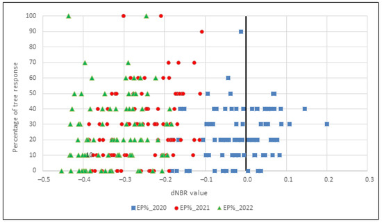 Reliability of the dNBR for forest fire recovery was tested post hoc because the dNBR is a well-recognised method of assessing fire impact [54,55]. The dNBR was preferred over the NDVI for this, although both methods are suitable for monitoring recovery [64]. There are various ways of improving the reliability of the NBR (and hence the dNBR), such as reducing false positives from water bodies and clouds [65], but distinguishing between different types of vegetative growth (e.g., epicormic shooting and coppicing) may be more difficult [66]. In the case regarding vegetation recovering from fire, the dNBR can quantify overall vegetative recovery [52,53]. There are other indices for burned-area mapping, but their evaluation requires more detailed field data. For example, the Burned Area Index for Sentinel-2 (BAIS2) [67] requires leaf area index data, which we could not record in our study. Our study focusses on koala habitats and therefore requires the assessment of specific types of tree regrowth responses, namely, epicormic shooting, coppicing, and apparent tree mortality. These responses were recorded at 88 plotless sites within the LSA over three years [18] as a percentage of trees and then compared using the dNBR and the NDVI to see if these responses could be identified and quantified using regression in SPSS [38].