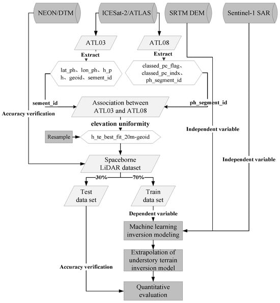 This study focuses on the estimation of understory terrain and develops a method that combines LiDAR, DEM, and SAR data for this purpose. In this study, the airborne remote sensing data obtained from the NEON were used to validate the accuracy of understory terrain derived from spaceborne LiDAR data from the ICESat-2. Within the coverage area of the spaceborne LiDAR data, the ICESat-2 data were divided into training and validation datasets, containing 70% and 30% of the overall data, respectively. The training dataset served as a dependent variable, whereas the DEM data and SAR data were used as independent variables to construct multiple machine learning models. These models were quantitatively evaluated using accuracy metrics (R2, RMSE, MAE). Subsequently, the machine learning model with the highest accuracy was employed to extrapolate the understory terrain at the regional scale, ultimately completing the estimation of the understory terrain. Figure 2 illustrates the flowchart of the method used in this experiment to estimate understory terrain.