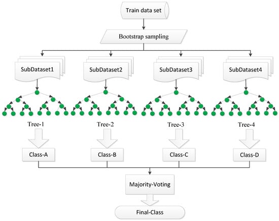 The Random Forest (RF) model, a BAGGING extension [52], introduces random attribute selection. Tree construction selects a subset of attributes for optimal partitioning, addressing overfitting and improving generalization. RF features sample and feature randomness: sample randomness follows BAGGING’s bootstrap sampling, ensuring data diversity. The randomness of features is a unique characteristic of Random Forest. It refers to the mechanism where, when selecting the optimal partitioning feature, Random Forest only considers a randomly selected subset of features [53]. This mechanism further enhances the randomness and generalization ability of the model. Figure 3 illustrates RF’s operational principle.