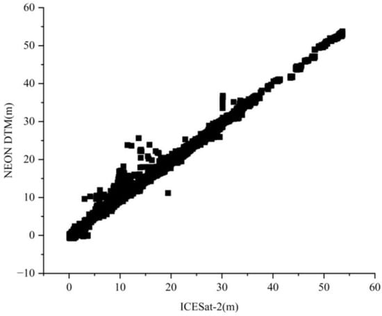 The scatter plot of the correlation between the NEON DTM data and ICESat-2 understory terrain data.
