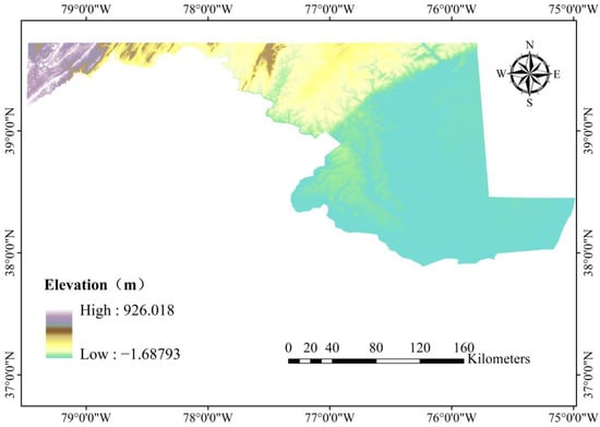 In this study, Maryland was selected as a study area. Maryland is located on the East Coast of the United States, within the South Atlantic region, having geographic coordinates of 37°69′–39°95′ N and 74°82′–79°71′ W. The state’s terrain of Maryland is highly diverse, ranging from dunes and low marshlands in the east to rolling hills across the region and ending with forested mountains in the west. The highest point in Maryland is 1025 m above sea level. The primary vegetation types in this area include shrublands, forests, and herbaceous plants, with tree heights reaching up to 45 m [22,31]. Figure 1 illustrates the SRTM DEM schematic of the study area.