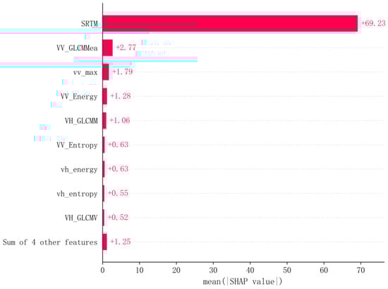 In this study, Sentinel-1 and SRTM data were used as the independent variable, and a total of 13 characteristic variables were extracted from it for research., including VV_GLCMMean, VV_MAX, VV_Energy, VH_GLCMMean, VV_Entropy, VH_Energy, VH_Entropy, VH_GLCMVariance, VV_GLCMVariance, VV_Homogeneity, VV_ASM, VV_Dissimilarity and SRTM DEM. The SHAP interpreter is used to reflect the impact of each characteristic variable on the prediction results. The SHAP value schematic diagram of the characteristic variables is presented in Figure 6. Among these variables, the SRTM DEM contributed the most to the estimation model, whereas the contribution rate of the 12 characteristic parameters from Sentinel-1 SAR data was relatively small. This was because, in forested areas, vegetation cover, and terrain complexity could pose certain obstacles to the propagation of radar signals, limiting the accuracy of radar images used for estimating understory terrain and, thus, affecting the accuracy of terrain estimation. However, compared to the SRTM data, the high-resolution images provided by Sentinel-1 SAR data could clearly show the detailed characteristics of understory terrain, including terrain fluctuations and vegetation cover, which were crucial for achieving an accurate estimation of the morphology and features of understory terrain. Therefore, the Sentinel-1 SAR data played a vital role and was a key element in understory terrain estimation.