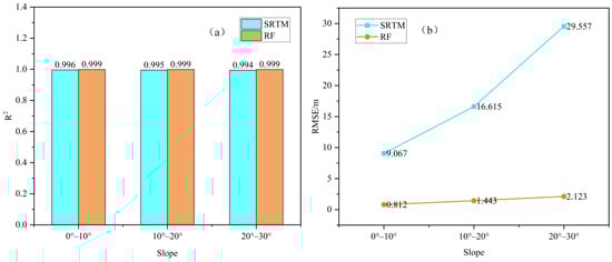 As shown in Figure 7a, compared to the original SRTM, the R2 of the RF model shows a slight improvement, all falling within the range of 0.999. This result indicates that under different slope conditions, the RF model provides a high degree of fit between its estimation of the understory terrain and the actual terrain. However, to avoid overfitting and consider other potential factors, further analysis is conducted using the RMSE, as shown in Figure 7b. The line chart of RMSE for the regional-scale understory terrain estimation by SRTM and the RF model clearly shows that as the slope increases, the estimation accuracy of the understory terrain gradually decreases. The study by Qin et al. [55] also demonstrated that the error of SRTM DEM increases significantly as the slope increases. As the terrain becomes steeper, photon noise gradually increases, leading to a larger discrepancy between the elevation data acquired by sensors and the actual terrain data. Consequently, the accuracy of the understory terrain estimated by both SRTM and the RF model decreases.