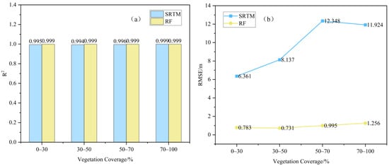 The schematic diagram of the evaluation indicators of the accuracy of the regional-scale data obtained by the SRTM and RF models under different vegetation coverage conditions: (a) R2; (b) RMSE.