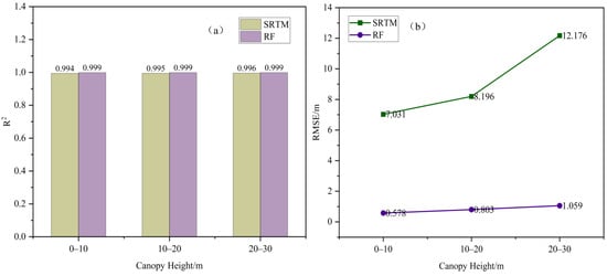 The schematic diagram of the evaluation indicators of the accuracy of the regional-scale data obtained by the SRTM and RF models under different canopy height conditions: (a) R2; (b) RMSE.