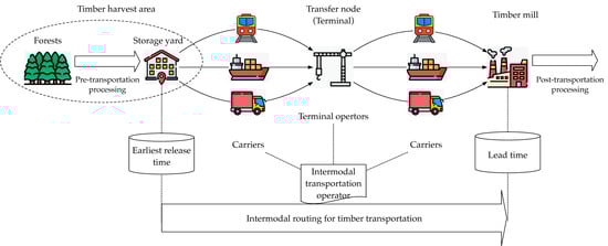 5]. Therefore, intermodal transportation is more suitable than road transportation for timber transportation, especially in the long-distance and bulk transportation setting. Moreover, in intermodal transportation, standardized containers (i.e., ISO containers) are used to carry the wood, which improves the handling efficiency of the entire transportation process. To date, timber transportation based on intermodality has received attention in both the literature [