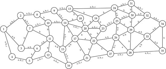 Equation (1) aims to minimize the total costs of accomplishing the intermodal transportation of the wood. The total costs include the travel costs, transfer costs, and carbon tax. Equation (2) is the flow equilibrium constraint; it ensures that there are only outbound and inbound flows at the storage yard of the timber harvest area and the timber mill, respectively, and that the transfer nodes have balanced inbound and outbound flows. Equation (3) ensures that the batch of wood is unsplittable when being moved on the arcs. Equation (4) ensures that the batch of wood is unsplittable when being transferred between different transportation service modes at the nodes. Equations (5) and (6) ensure a reasonable connection between the travel and transfer processes on the planned transportation route. Equation (7) ensures that the departure time of the wood from the storage yard of the timber harvest area is not earlier than the given earliest release time. It also assumes that the arrival time of the wood at the origin is its pickup (departure) time in order to initialize the computation of Equation (8). Equation (8) calculates the arrival time of the wood at the node on the planned transportation route. Equation (9) is the service time window selection constraint, and it regulates the following condition: if the transfer node is covered on the planned transportation route, one of its service time windows must be selected. Equation (10) restricts the arrival time of the wood to ensure that it can be transferred immediately or that its travel process can be continued. Equation (11) ensures that the arrival of the wood at the timber mill is not later than the lead time. Equations (12) and (13) are the capacity constraints. Equations (14)–(17) are the variable domain constraints.