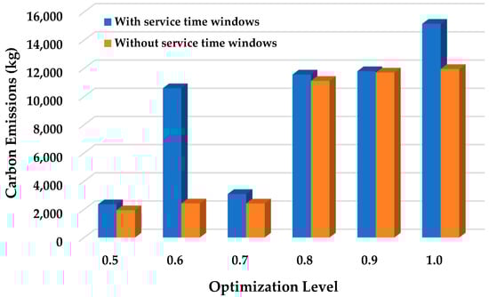 The service time windows of the transfer nodes influence the routing optimization for timber transportation and lead to an increase in total costs and carbon emissions. Therefore, when building an intermodal transportation network for timber transportation, the intermodal transportation operator should consider not only capacities, but also service time windows when selecting the terminal operators (i.e., the transfer nodes).