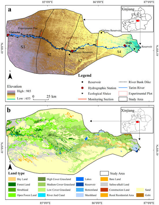 The Tarim River is located along the northern edge of the Taklamakan Desert within the Tarim Basin and is the longest inland river in China, with a total length of 2137 km [20]. This study focuses on the middle reaches of the Tarim River that covers the section from Yingbazha to Qiala and spans a total length of 398 km. Protective embankments are present on both sides of the river, with widths ranging from 1 to 3 km (Figure 1). In 2000, the government constructed water diversion dams and ecological gates along the main channel, with 34 ecological gates built in the middle reaches of the Tarim River; construction was completed in 2009 [19]. The floodwaters during the flood season can be effectively converted into ecological water, supplying vegetation such as the P. euphratica forests along the Tarim River [26,28]. This region is characterized by an extremely arid continental warm climate, with sparse rainfall and high evaporation rates [29]. The average annual precipitation ranges between 18 and 45 mm, while the average annual evaporation reaches between 2500 and 3000 mm. The main soil types include sandy soil, oasis meadow soil, meadow soil, and saline soil [25]. For this study, we segmented the area from Yingbazha to Qiala into four distinct sub-regions: