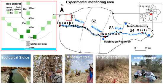 Monitoring transects and plots were established as follows. Beginning 150 m from the ecological gate, three replicate transects were set up. The river water could reach only approximately 600 m from the discharge point, so plots were arranged within this 600-m range. Tree plots, each sized 25 by 25 m, were established at 150-m intervals along each transect. Within each tree plot, two shrub plots, each measuring 5 by 5 m, and three herbaceous plots, each measuring 1 by 1 m, were randomly placed. A total of three monitoring transects and 12 tree monitoring plots were set up in the Kambaerwustan monitoring area of the middle reaches of the Tarim River (Figure 2).