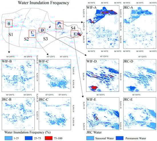 The mixed spectral index method for waterbody extraction is still affected by mountain shadows. Shadows can cause variations in the spectral response of identical objects, leading to substantial deviations in water and vegetation index values within the same area. To mitigate the impact of shadows on NDVI, object-oriented methods are commonly employed to detect and adjust DN values in shadowed regions [38]. Alternatively, terrain-correction models are applied [39]. Given that waterbodies are mainly situated in flat terrains, numerous researchers have utilized terrain slope data to reduce the influence of shadows in mountainous regions across various images [40]. This study adopted previous research findings [41] to improve the extraction results by setting a rule that eliminates mountain shadows in waterbodies when the slope is less than 8°. The method for calculating the Water Inundation Frequency (WIF) involves determining the ratio of the total number of times a waterbody is identified each year to the number of effective observations. Based on previous research [42], regions with 25% < WIF ≤ 75% are defined as seasonal waterbodies, whereas regions with WIF > 75% are defined as permanent waterbodies. The formula for calculating WIF is presented as follows: