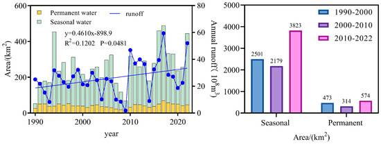 A comprehensive assessment of the SWA in the middle reaches of the Tarim River (MROTR) from 1990 to 2022 was conducted, including both permanent and seasonal water bodies, as well as their cumulative total. In this area, the total SWA increased from 79.36 km2 in 1990 to 490.98 km2 in 2022, which is an increase of 411.62 km2, with an average annual growth rate of 12.47 km2 per year (Figure 4). Specifically, in the non-ecological gate (NEG) phase, the growth of SWA was particularly notable, with an annual change rate reaching 20.5 km2. This was largely due to substantial fluctuations in uncontrolled natural runoff that caused waterbody expansion. Between 2000 and 2010, as the EGC commenced, the SWA decreased to 87.73 km2, with an average annual change rate of −16.88 km2/year, reflecting instability in water resource management during the initial stages of ecological gate development. However, during the ecological gate-controlled water (EGCW) phase, the SWA increased rapidly, with an average annual growth rate of 28.8 km2/year, particularly in the seasonal water area, which expanded at a rate of 11.86 km2/year. This indicates the effectiveness of the ecological gates in regulating water resources.
