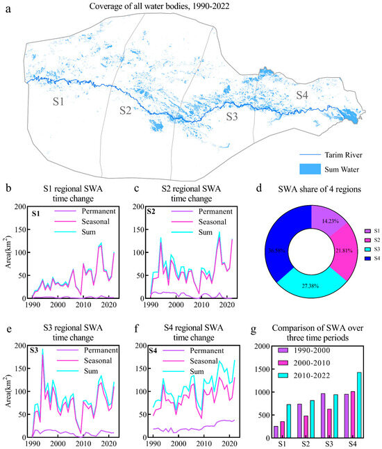 Sections S1–S4 SWA in the MROTR, 1990–2022. (a) Coverage of all water bodies,1990-2022. (b) Characteristics of temporal changes in SWA in the S1 region. (c) Characteristics of temporal changes in SWA in the S2 region. (d) S1–S4 regional SWA percentage. (e) Characteristics of temporal changes in SWA in the S3 region. (f) Characteristics of temporal changes in SWA in the S4 region. (g) Comparison of SWA over three time periods.