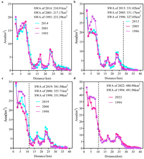 Changes in SWA at varying distances from the riverbank in different water volume years. (a) Change in SWA in a normal year. (b) Change in SWA in a wet year. (c) Change in SWA in a wet year. (d) Change in SWA in a extremely wet years year.