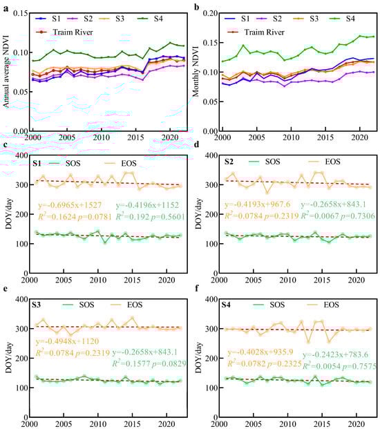 Time series of the interannual vegetation indicators of the MROTR, 2000–2022. (a). Annual mean NDVI (b). June–September monthly mean NDVI (c–f). Annual mean vegetation phenology.