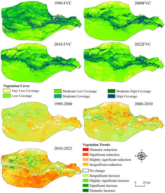 Spatial distribution and trends of the vegetation cover in the MROTR, 1990–2022.