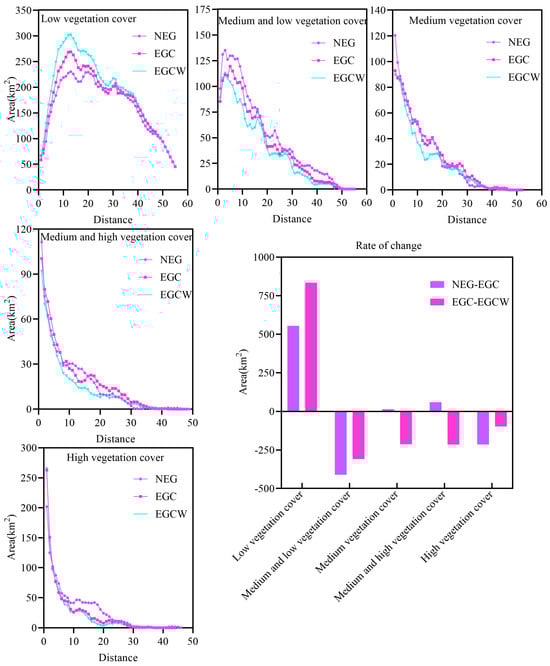 The average vegetation cover during the NEG, EGC, and EGCW phases was calculated, along with the area of each vegetation cover type in 1-km increments within a 55-km distance from the riverbank (Figure 9). Within 15 km of the riverbank, the area of low vegetation cover increased as the distance from the riverbank grew, but beyond 15 km, it gradually decreased. Between 1990 and 2022, the areas with low vegetation cover followed the order EGCW > EGC > NEG. For the other vegetation cover types, the area consistently decreased as the distance from the riverbank increased. The rates of increase and decrease in the vegetation cover area differed across vegetation types prior to and following the construction of the ecological gates. Further analysis was conducted to compare the vegetation cover area change rates between the NEG and EGC phases and between the EGC and EGCW phases. The results indicated that the increase in low vegetation cover was more pronounced during the EGC-EGCW phase than during the NEG-EGC phase. Conversely, the reduction in medium–low and high vegetation cover was less significant during the EGC-EGCW phase than during the NEG-EGC phase. These findings suggest that the implementation of water control at the ecological gates increased the area of low vegetation cover while mitigating the reduction trends for medium–low and high vegetation cover types.