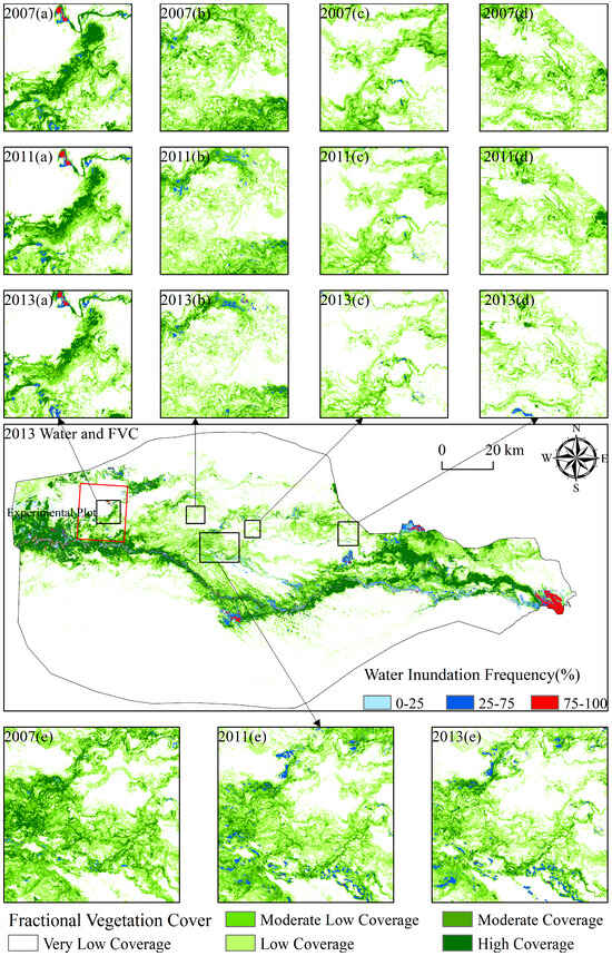 Vegetation FVC in the MROTR remote sensing monitoring area in 2016, 2017 and 2018 (each monitoring area corresponds to the vegetation FVC of the year and the surface waterbody of the year).