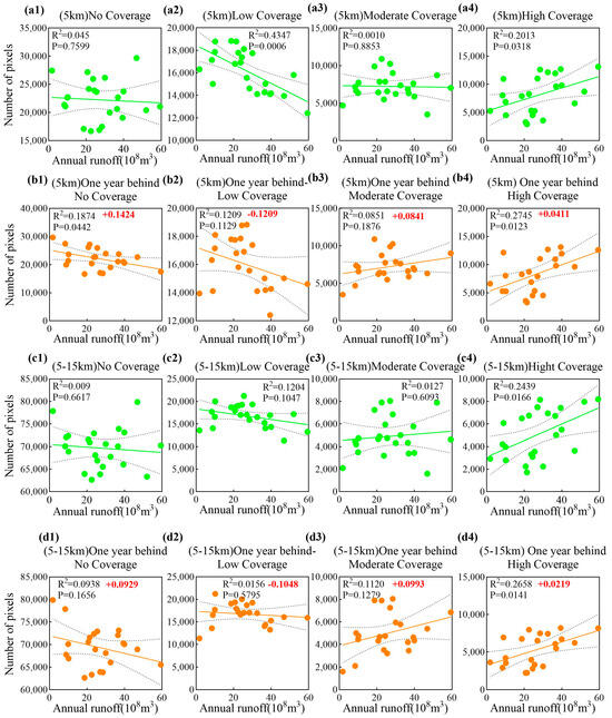 Our study also reveals that SWA was significantly negatively correlated with low-coverage vegetation within 15 km of the river channel (Figure 12a2,b2,c2,d2). Low-coverage vegetation was more influenced by water bodies in the same year, as shown in Figure 12b2,d2, where the correlation between water bodies and vegetation weakened when there was a 1-year lag. These low-coverage vegetation types, mainly grasses and shrubs [64], such as Suaeda spp. and Calligonum spp., typically have shallow root systems and are highly dependent on surface water and topsoil moisture [65,66]. These plants often respond strongly to annual precipitation, river replenishment, and surface water expansion, as their short growth cycles cause water fluctuations to be rapidly reflected in the vegetation cover and growth conditions in the same year [67]. As the river flow increases, the SWA expands, which increases the moisture content of the shallow soil and provides a favorable environment for seed germination. However, due to strong evaporation, salinization becomes severe, and the increased water volume washes surface salts into one area. During this period of high soil salinity, it becomes difficult for seedlings to transition to young forests [68,69,70], resulting in a decline in low-coverage vegetation during this phase. In contrast, SWA promotes the growth of medium- and high-coverage vegetation, with a lag effect that extends as water volumes increase (Figure 12). The varying river flow volumes have significant effects on vegetation at different distances from the river, and they promote the growth of medium- and high-coverage vegetation types. Medium- and high-coverage vegetation are composed mainly of deep-rooted plants, such as Populus euphratica [71] and salt-tolerant species, such as Tamarix spp. [64]. Since their roots can penetrate deep into the ground and adapt to dry and saline-alkaline soil conditions [72,73], their growth is often influenced by groundwater levels and long-term water infiltration. Therefore, their growth trends are more dependent on water conditions from previous years, which explains why medium- and high-coverage vegetation are more affected by the previous year’s waterbodies than by the current year’s waterbodies.