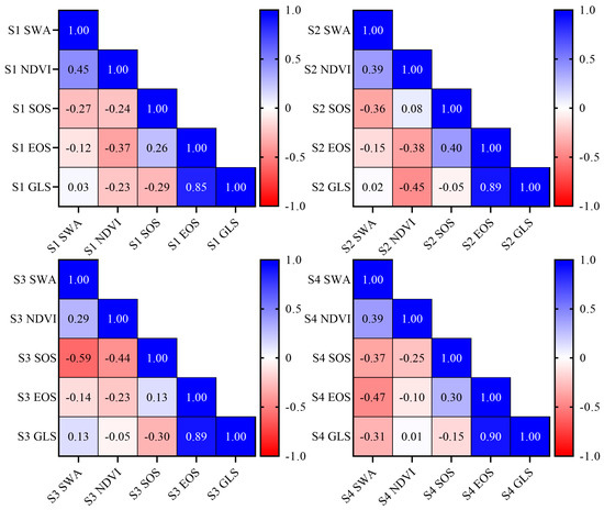 The Pearson correlation coefficient [53] was used to calculate the correlation between SWA data and FVC on a pixel-by-pixel basis, thus quantifying the relationship between FVC and SWA. The formula is as follows: