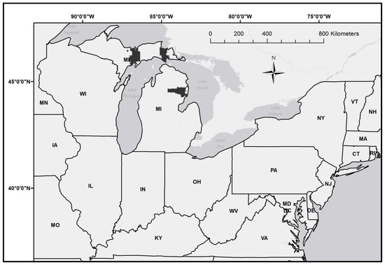 - Handler, S.; Duveneck, M.J.; Iverson, L.; Peters, E.; Scheller, R.M.; Wythers, K.R.; Brandt, L.; Butler, P.; Janowiak, M.; Swanston, C.; et al. Michigan Forest Ecosystem Vulnerability Assessment and Synthesis: A Report from the Northwoods Climate Change Response Framework; Gen. Tech. Rep. NRS-129; Northern Research Station, U.S. Department of Agriculture, Forest Service: Durham, NH, USA, 2014; 229p.