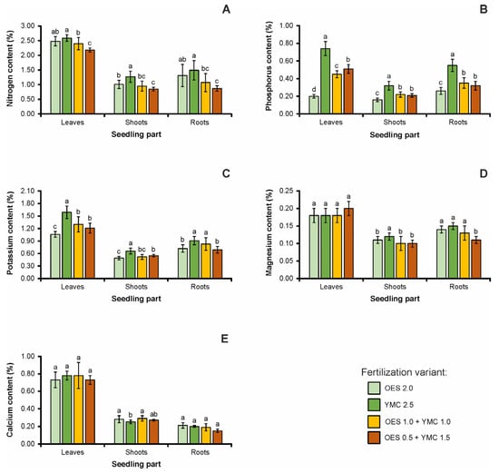 Higher values of N, P, K, Mg, and Ca were recorded in the assimilation apparatus of the seedlings compared to other parts of the plant. The concentration of elements in the seedling leaves differed significantly depending on the fertilizer used (Figure 1). The lowest N concentration was recorded for the OES 0.5 + YMC 1.5 fertilizer, which differs significantly from other variants. A similar relationship was recorded with the P and K contents of the leaves. For the Ca and Mg concentration in leaves, no statistically significant differences were found.