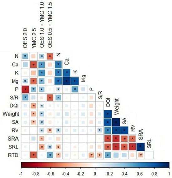 Spearman’s linear correlation showed that the OES 2.0 fertilizer negatively correlates with P content, whereas it positively correlates with Mg and the S/R ratio. YMC 2.5 shows a positive correlation with P and a negative correlation with Ca and Mg, as well as with individual parameters—DQI, weight, SA and RTD. The mixed fertilization variant OES 1.0 + YMC 1.0 shows a positive correlation with all analyzed elements and the parameters DQI, SA, RV and mass. In addition, a negative correlation was shown with the parameters SRA and SRL. OES 0.5 + YMC 1.5 fertilizer negatively correlates with nitrogen and S/R ratio and RV, and a positive correlation was noted between SRL and RTD. A strong correlation was also noted between various root parameters. The other elements showed no statistically significant differences (Figure 2).
