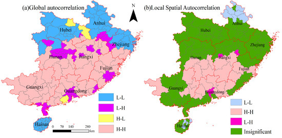On the other hand, 27 cities were identified as the low–high (L-H) type, scattered across Yiyang, Xiangtan, and Changsha in Hunan Province; Quanzhou, Xiamen, and Putian in Fujian Province; as well as Dongguan and Zhanjiang in Guangdong Province. These cities demonstrate spatial heterogeneity, displaying marked contrasts in certain characteristics when compared to their neighboring cities.