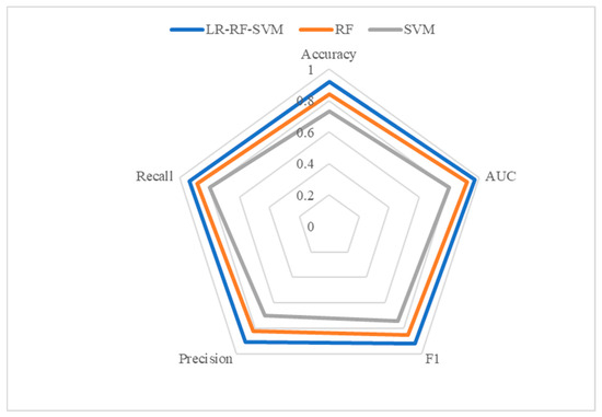 As shown in Figure 6, the study first assessed the predictive performance of the individual models, SVM and RF, separately. The SVM model demonstrated a reasonable level of accuracy, achieving an accuracy of 0.73, a precision of 0.70, a recall of 0.80, an F1 score of 0.74, and an AUC value of 0.80. These indicators suggest that while the SVM model has some strengths in its performance, there is still room for improvement. In contrast, the RF model showed a significant improvement in predictive performance, with an accuracy of 0.84, a precision of 0.82, a recall of 0.88, an F1 core of 0.85, and an AUC value of 0.92, demonstrating the RF model’s stronger ability to handle complex data and classification tasks. However, by constructing the LR-RF-SVM ensemble learning model, we achieved a further leap in predictive performance. The ensemble model had an accuracy of 0.92, an AUC value of 0.97, an F1 score of 0.92, a precision of 0.91, and a recall of 0.94, all of which far exceeded the results obtained by the single models. These results fully demonstrate the significant advantage of ensemble learning in integrating the prediction results of multiple base models and improving overall performance. This research not only verifies the effectiveness of ensemble learning methods but also provides strong support and a reference for subsequent related research and applications. (Note: The accuracy results are rounded to two decimal places.)