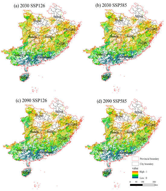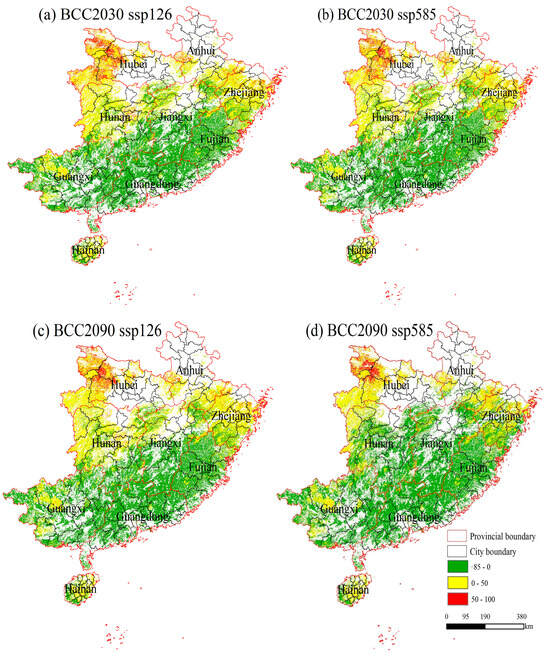Under the severe challenges posed by future climate scenarios, Figure 7 illustrates the unprecedented changes in the spatial distribution of wildfire occurrences across southern forest regions. High-occurrence areas persistently encompass numerous cities in Hunan, Hubei, southern Anhui, Jiangxi, and Zhejiang, and a notable trend emerges: wildfire occurrences are gradually spreading northward, posing significant threats to previously low-occurrence areas. In the SS585 scenario, some parts of Fujian Province experience a relative decrease in wildfire occurrences amidst a general upward trend, highlighting the complexity and intensification of forest fire threats driven by climate change. This necessitates a deeper understanding of climate change’s impacts and an urgent reevaluation and adjustment of existing forest fire prevention strategies.
