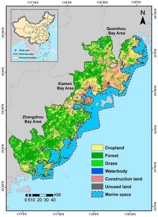 Land use or land cover data were obtained from Landsat TM remote sensing images by visual interpretation. Land use was divided into six primary land classifications (i.e., cropland, forest, grass, waterbody, construction land, and unused land) and 13 secondary land classifications (i.e., paddy land, dry land, forested land, shrub land, open forested land, high-cover grassland, low-cover grassland, rivers, reservoirs, mudflats, urban land, rural land, and transportation, industrial, and mining land). The accuracy was 30 m. The spatial vector data were from the national 1:4 million fundamental map. The percentage of Class I and Class II marine water quality was derived from the Marine Environment Bulletin of Fujian Province, and the optical thickness of marine aerosol particles was obtained from NASA Earth observation data. Socioeconomic data were mainly derived from the 2016 statistical yearbooks of Quanzhou City, Zhangzhou City, and Xiamen City.