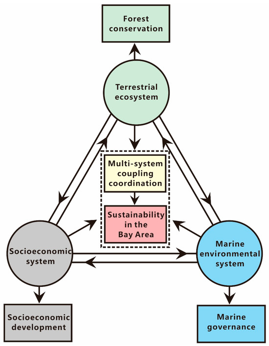 Coupling coordination analysis can be utilized to reveal problems that may arise in achieving sustainable development. A multi-system coupling coordination analysis of the terrestrial ecosystem, marine environmental system, and socioeconomic system would contribute to sustainability in the bay area by promoting the integrated objectives of forest conservation, ocean governance, and socioeconomic development.