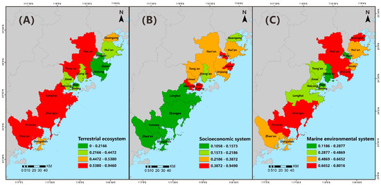 The comprehensive assessment values of the various systems were divided into four classifications by the natural breaks (Jenks) algorithm. Figure 3 presents the spatial distribution of the terrestrial ecosystem, marine environmental system, and socioeconomic system in the bay area of the Fujian River Delta. The development levels of the terrestrial ecosystem and socioeconomic system in the bay area of the Fujian River Delta present a dramatically opposite spatial distribution pattern. The socioeconomic development level has significant spatial variability, with a distribution pattern that is high in the northeast and low in the southwest. The areas with a high socioeconomic development level mainly focus on the core areas of Xiamen Island (i.e., Siming District and Huli District) and southeast of Quanzhou Bay area (i.e., Shishi City, Fengze District, and Jinjiang City). Meanwhile, the overall socioeconomic development level of the Zhangzhou Bay area lags behind that of the Xiamen Bay area and the Quanzhou Bay area. Although Xiamen Island has excellent strength in its socioeconomic system, its terrestrial ecosystem lags significantly behind other bay areas in the Fujian River Delta. The overall terrestrial ecosystem development level in the Zhangzhou Bay area is higher than the average value of the bay area of the Fujian River Delta, with sound ecological environmental quality. In addition, most of the districts and counties in the Quanzhou Bay area have a low terrestrial ecosystem assessment value, especially in the southeast of the Quanzhou Bay area, which has the weakest level. The marine environmental condition in the bay area of the Fujian River Delta demonstrates a “dumbbell-shaped” spatial distribution pattern with a relatively high level in its northeast and southwest. However, the marine environmental conditions are relatively poor in the Xiamen Bay area and the northern part of the Zhangzhou Bay area.