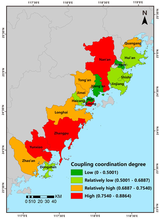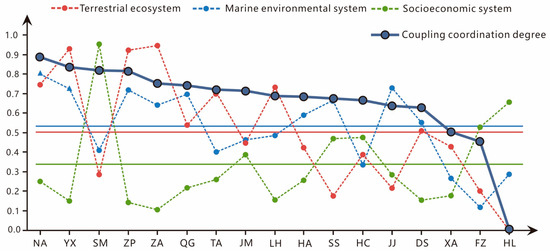 There is a large spatial difference in the coupling coordination degree between the terrestrial ecosystem, marine environmental system, and socioeconomic system across the districts and counties in the bay area of the Fujian River Delta (Figure 4). Compared to the Xiamen Bay area and the Quanzhou Bay area, the districts and counties in the Zhangzhou Bay area have the highest average coupling coordination degree. However, there is a relatively low coupling coordination degree between the terrestrial ecosystem, marine environmental system, and socioeconomic system in the southeastern districts and counties of Quanzhou Bay. Huli District in the Xiamen Bay area is the core area supporting Xiamen’s socioeconomic development. Xiang’an and Haicang Districts are undergoing rapid urbanization and high-speed development. These areas exert enormous pressure on both terrestrial and marine ecosystems, resulting in a low degree of coupling coordination between the terrestrial ecosystem, marine environmental system, and socioeconomic system.