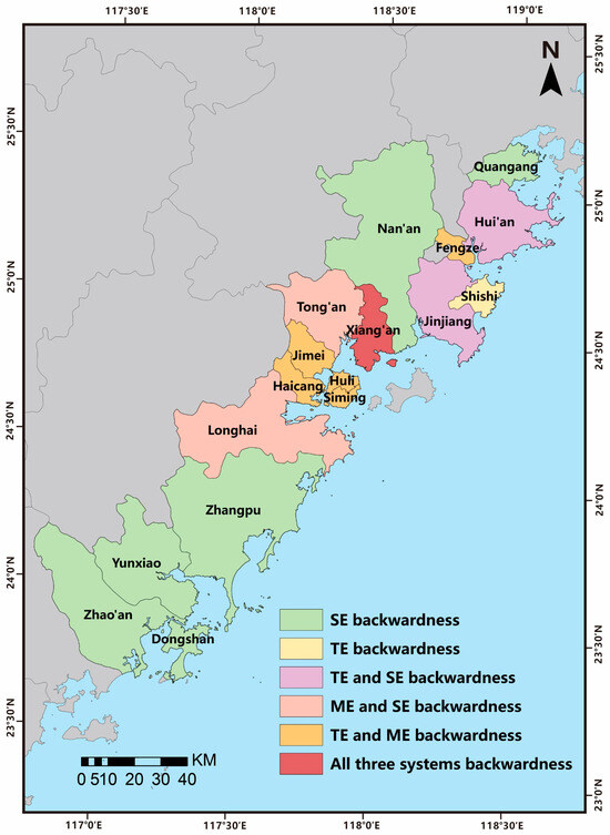 The significant spatial variation in the coupling coordination degree is related to each system’s uneven development of districts and counties in the bay area (Figure 5). To reveal the existing coupling coordination problem and identify key constraints to sustainable development in the bay area, the average level of each system was employed as a threshold value to screen out districts and counties with various lagging development types (Figure 6). This is conducive to discovering the reasons for poor regional coupling coordination and provides a foundation for establishing targeted sustainability management measures. Of the regions, 47% have terrestrial ecosystem conditions that are weaker than the threshold level. Many forests have been destroyed, and their ecological functions have been degraded. These areas are mainly concentrated in the districts and counties of the Quanzhou Bay area and around Xiamen Bay, Maluan Bay, and Xinglin Bay. The marine environmental condition is below the critical level in 47% of the areas, mainly focused in the marine space of the Xiamen Bay area. Moreover, 65% of regions with socioeconomic development below the threshold are primarily distributed throughout the entire Zhangzhou Bay area, most of the districts and counties in the Quanzhou Bay area, and Tong’an district and Xiang’an district in Xiamen Bay. In general, 41% of districts and counties in the bay area of the Fujian River Delta suffer from a backwardness problem in one of the systems. While more than half of the districts and counties are in areas where two systems are lagging simultaneously, these districts face two types of outstanding issues that must be addressed. Hui’an County and Jinjiang City in the Quanzhou Bay area are simultaneously confronted with backwardness in their terrestrial ecosystems and socioeconomic systems. The Tong’an District in Xiamen Bay area and Longhai City in the Zhangzhou Bay area face backwardness in both the marine environmental system and the socioeconomic system. The problem of underdevelopment in both the terrestrial ecosystem and marine environmental system involves the Fengze District in the Quanzhou Bay area and the Jimei, Haicang, Huli, and Siming Districts in the Xiamen Bay area.