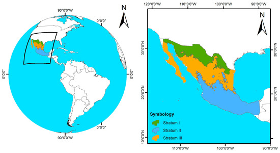 The stratification process of the coniferous forests in Mexico resulted in three strata: stratum I, located in the northwest of the country (Figure 2a; n = 60), stratum II, in the central-southern part of the country (Figure 2b; n = 450), and stratum III, located in the Sierra Madre Occidental, SMO (Figure 2c; n = 463). The sample size for each stratum varies, as indicated in Table 1. This variation is determined by the geographic extent of each stratum generated during the stratification process and by the number of National Forest and Soil Inventory sites located within each stratum.