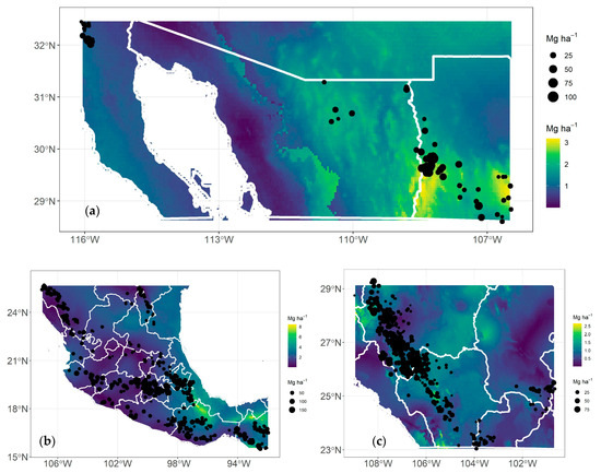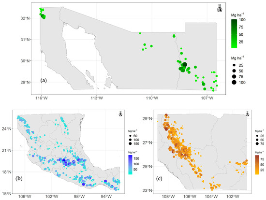 Prediction of current carbon density of aboveground live biomass in Mexican conifer forests through bioclimatic models: stratum I (a), stratum II (b), and stratum III (c). Circle size and color gradient indicate values of carbon density of aboveground live biomass (Mg C ha−1).
