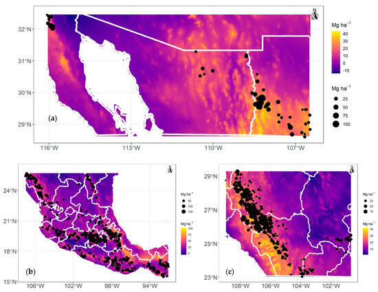 Using the bioclimatic models generated here, at the INFyS sites, predictions range from 7.48 to 34.79 Mg C ha−1, from 16.68 to 71.29 Mg C ha−1, and from 10.98 to 41.91 Mg C ha−1 for strata I, II, and III, respectively (Figure 3a–c). The highest cdAGB is observed/predicted in stratum II (Figure 3b) in the central region of the country. The highest differences between the observed cdAGB and estimated cdAGB are −19 and +30, −52 and +124, −29 and +56 Mg C ha−1, respectively, for strata I, II, and III.