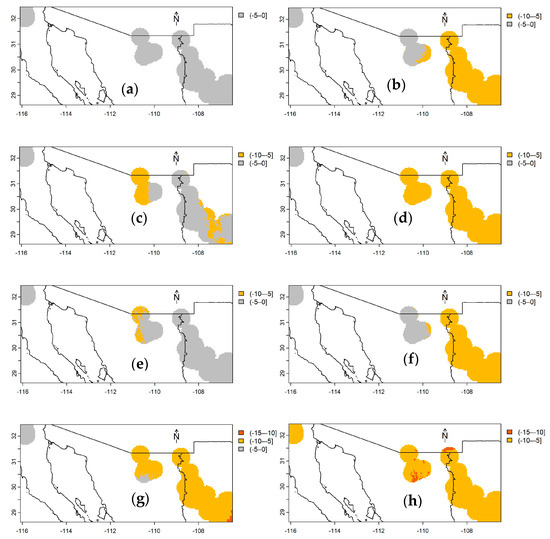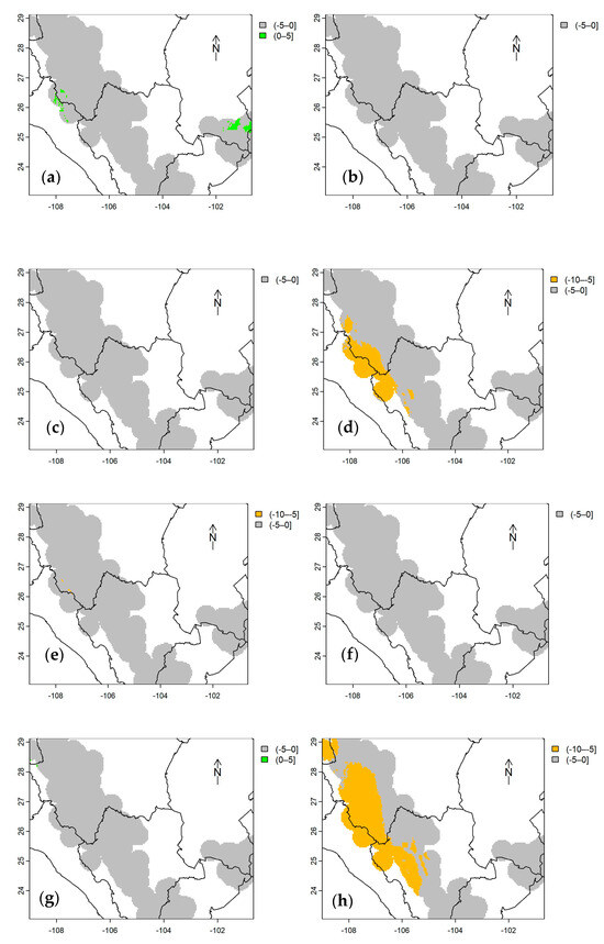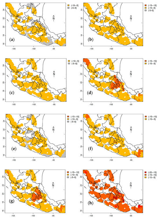 According to future predictions of cdAGB up to 2050 and 2070 (Figure 4, Figure 5 and Figure 6) using the bioclimatic model for each stratum (Equations (1)–(3)), under any climate scenario (RCP), only reductions in cdAGB are expected. Forests in stratum II (Figure 5a–h, situated in the central and southern regions of the country) would be the most affected, with decreases ranging from −5 to −10 Mg ha−1, potentially up to −20 Mg C ha−1 by 2070, whereas those in stratum III (Figure 5a–h, SMO) would experience lesser impacts ranging from 0 to −5 Mg C ha−1 (Table 4). The most significant losses of cdAGB are expected under RCP 8.5 and are anticipated to be greater by 2070.