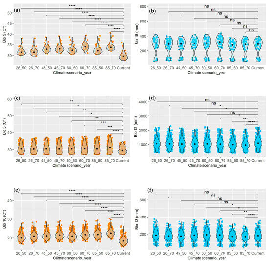 Wilcoxon test for comparing medians of the current variable with each climate scenario, in strata I (a,b), II (c,d), and III (e,f). Bio 05: Max Temperature of Warmest Month (°C); Bio 10: Mean Temperature of Warmest Quarter (°C); Bio 12: Annual Precipitation (mm); Bio 13: Precipitation of Wettest Month (mm); Bio 18: Precipitation of Warmest Quarter (mm). Significance levels: ns (Not significant), * (Significant at 0.05%), ** (Significant at 1%), *** (Significant at 0.1%), **** (Significant at 0.01%).