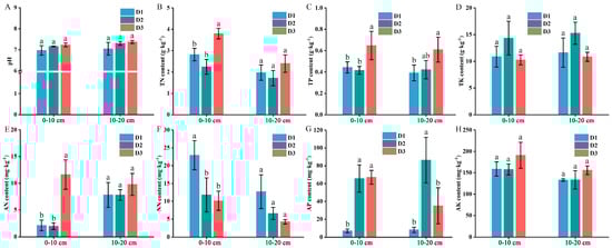 Variations in soil properties at different stand densities and soil depths. (A) pH; (B) TN, soil total nitrogen; (C) TP, total phosphorus; (D) TK, total potassium; (E) AN, ammonium N; (F) NN, nitrate N; (G) AP, available P; and (H) AK, available K. Different lowercase letters indicate significant differences among the three densities at the p < 0.05 level.