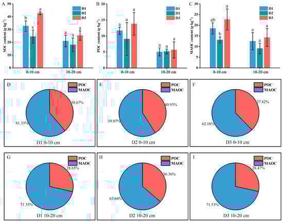 Soil organic carbon (SOC, (A)), particulate organic carbon (POC, (B)), and mineral-associated organic carbon (MAOC, (C)) contents in plantations with different stand densities and soil depths. The calculated proportions of POC and MAOC in the SOC at different densities in the 0–10 cm (D–F) and 10–20 cm (G–I) soil layers. Different lowercase letters indicate significant differences among the three densities at the p < 0.05 level.