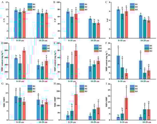 Soil microbial biomass carbon (MBC), nitrogen (MBN), phosphorus (MBP) contents, elemental stoichiometry, and microbial biomass stoichiometry. (A) C:N ratios; (B) C:P ratios; (C) N:P ratios; (D) MBC contents; (E) MBN contents; (F) MBP contents; (G) MBC:MBN ratios; (H) MBC:MBP ratios; (I) MBN:MBP ratios. Different lowercase letters indicate significant differences among the three densities at the p < 0.05 level.